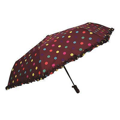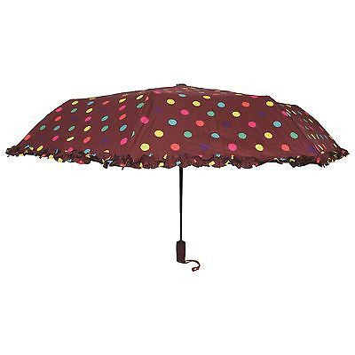Brown umbrella with 8 ribs. With printed polka dots and frills at the edges. Material: pongee. Both automatic opening and closing. Fold Length-30cm, Open Height -56 cm. Strong